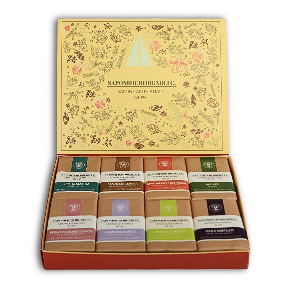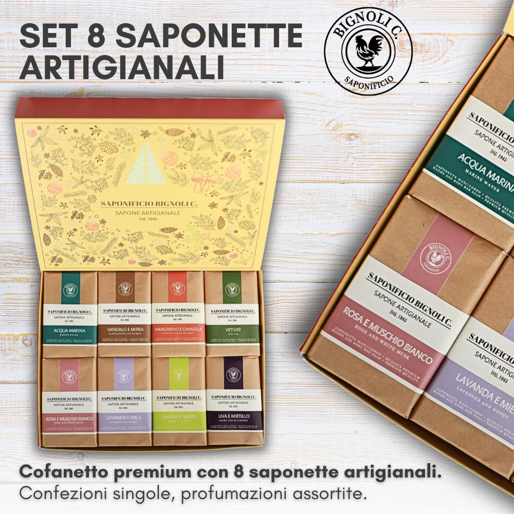 Un set regalo curato nei dettagli: otto saponette artigianali in un cofanetto premium illustrato, Made in Italy. È una scelta elegante per chi ama alternare profumazioni diverse e un’ottima idea per saponi regalo pronti da donare.